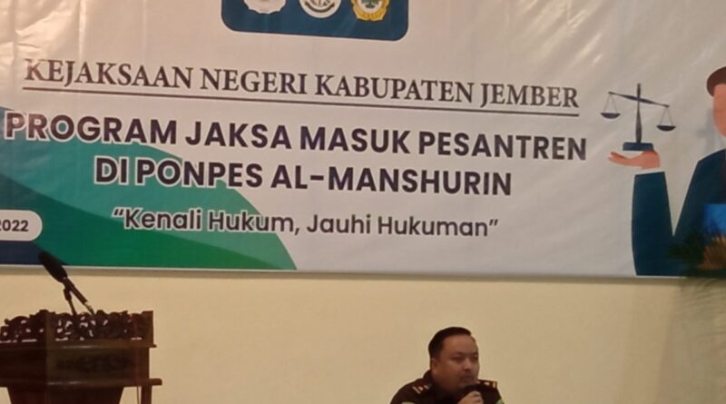 Kejaksaan Negeri Jember gandeng Ormas LDII yang juga membina ribuan santri di pondok pesantren. Dalam paparan materinya, Jaksa Fungsional Kejaksaan Negeri Jember, R.Yuri Andina Putra menjelaskan bahwa program Jaksa Masuk Pesantren merupakan program Kejaksaan RI yang dicanangkan di seluruh wilayah Indonesia dengan tujuan yaitu pengenalan serta pembinaan hukum sejak dini kepada para santri untuk mengenal hukum dengan memberikan Tag Line: